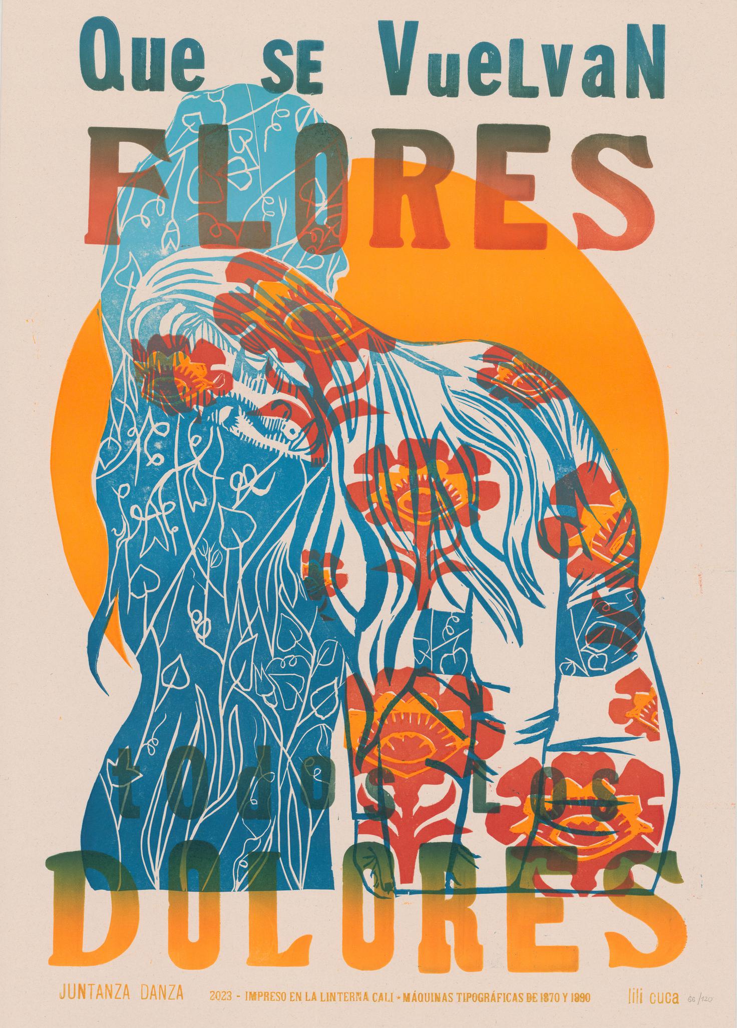 Titel: "Que se vuelvan flores todos los dolores" • Künstler*in: Juntanza Danza & Lili Cuca • Herkunftsland: Kolumbien • Edition: Limitiert auf 120 Stücke • Große: 50 x 70 cm • Papier: Zuckerrohpapier Earth Pack +/- 300 g/qm • Hauptkollektion: Feminist Art • Nebenthema: Activism - Artivism