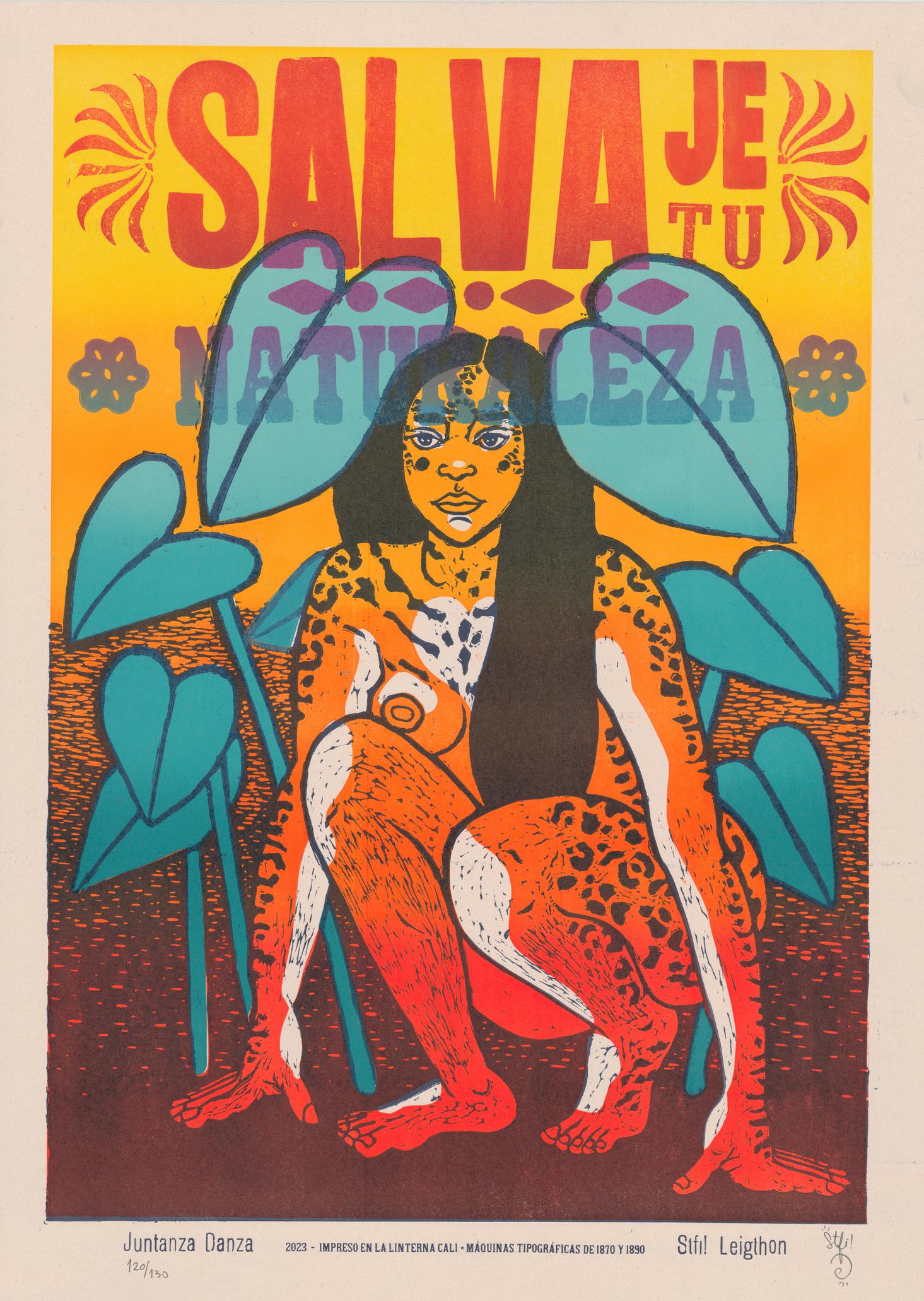 Titel: "Salvaje tu naturaleza" • Künstler*in: Juntanza Danza & Stfi! Leigthon • Herkunftsland: Kolumbien • Edition: Limitiert auf 130 Stücke • Signiert von der Künstler*in • Große: 50 x 70 cm • Papier: Zuckerrohpapier Earth Pack +/- 300 g/qm • Hauptkollektion: Feminist Art • Nebenthema: Activism - Artivism