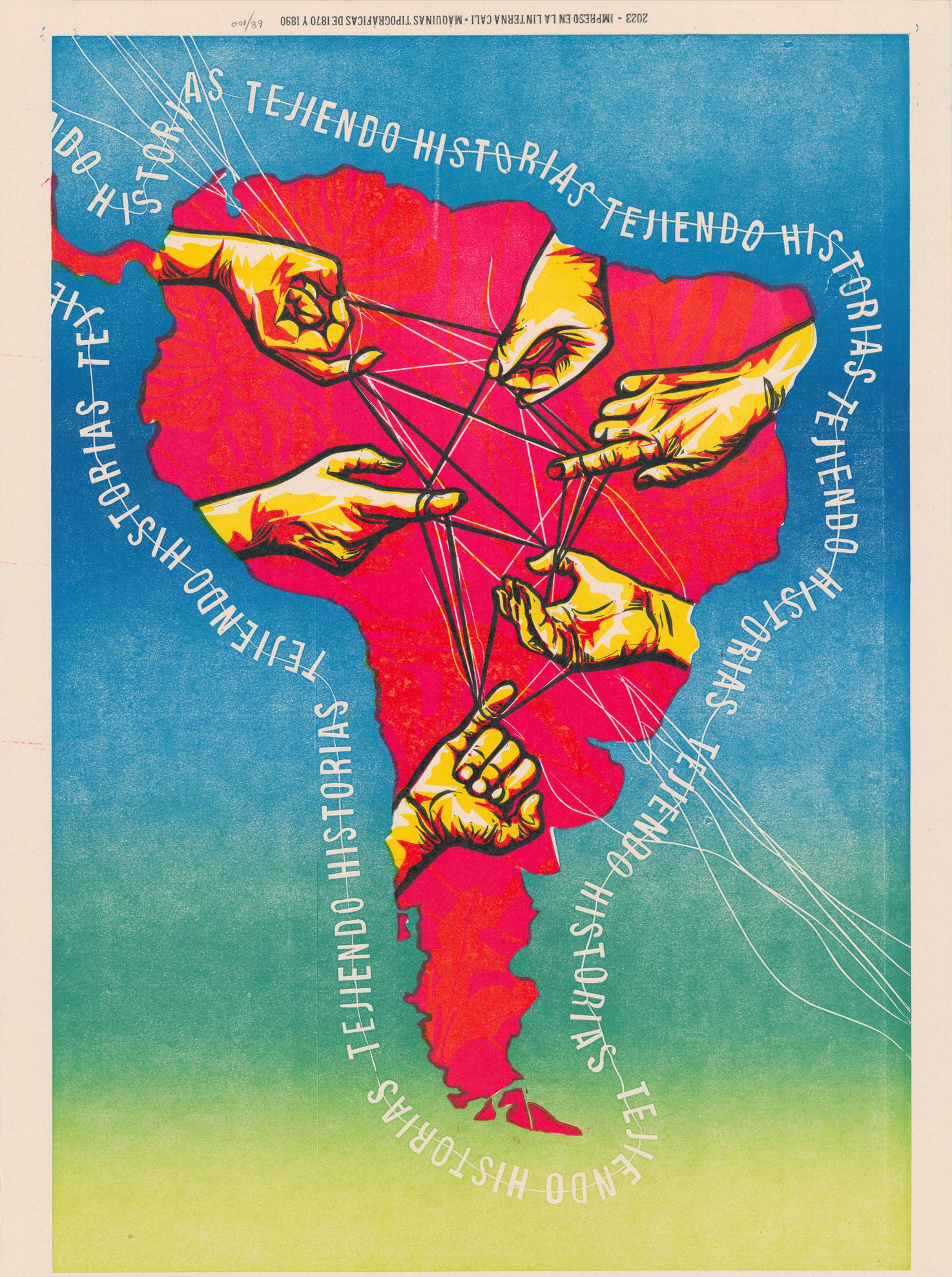 Titel: "Tejiendo historias" • Künstler*in: Museos de la Paz • Herkunftsland: Kolumbien • Edition: Limitiert auf 100 Stücke • Große: 50 x 70 cm • Papier: Zuckerrohpapier Earth Pack +/- 300 g/qm • Hauptkollektion: Activism - Artivism